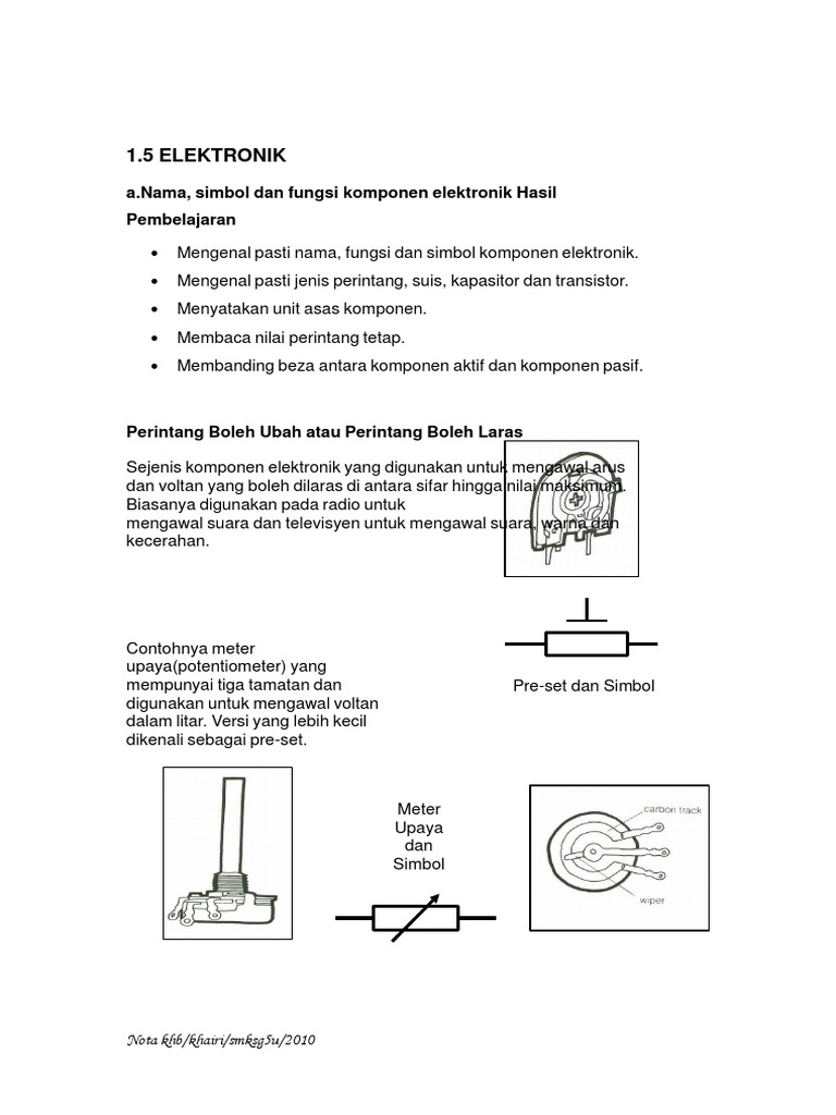 Perintang pembolehubah / rheostat (iec) perintang perapi: Perintang boleh laras ialah sejenis perintang yang mempunyai nilai rintangan yang tidak tetap tetapi boleh diubah. Ω) ialah unit si bagi rintangan elektrik, dinamakan sempena georg simon ohm. Dua ciri penting perintang adalah. Perintang terbahagi kepada dua (2) jenis iaitu, perintang boleh laras dan juga perintang tetap. Satu ohm bersamaan satu volt se ampere. Perintang boleh laras atau simbol : Digunakan untuk mengawal arus dan voltan yang boleh dilaras di antara sifar hinggasebelum nilai maksimum. May 18, 2012 · komponen elektronik meter upaya reostat nama : Nilai perintang ditandakan dengan kod warna. More images for simbol perintang boleh laras » 2.1 nama, simbol, dan fungsi komponen elektronik simbol l.e.d: Nilainya diukur dalam unit ohm ( ω) semakin tinggi nilai rintangan semakin rendah arus yang mengalir melaluinya.